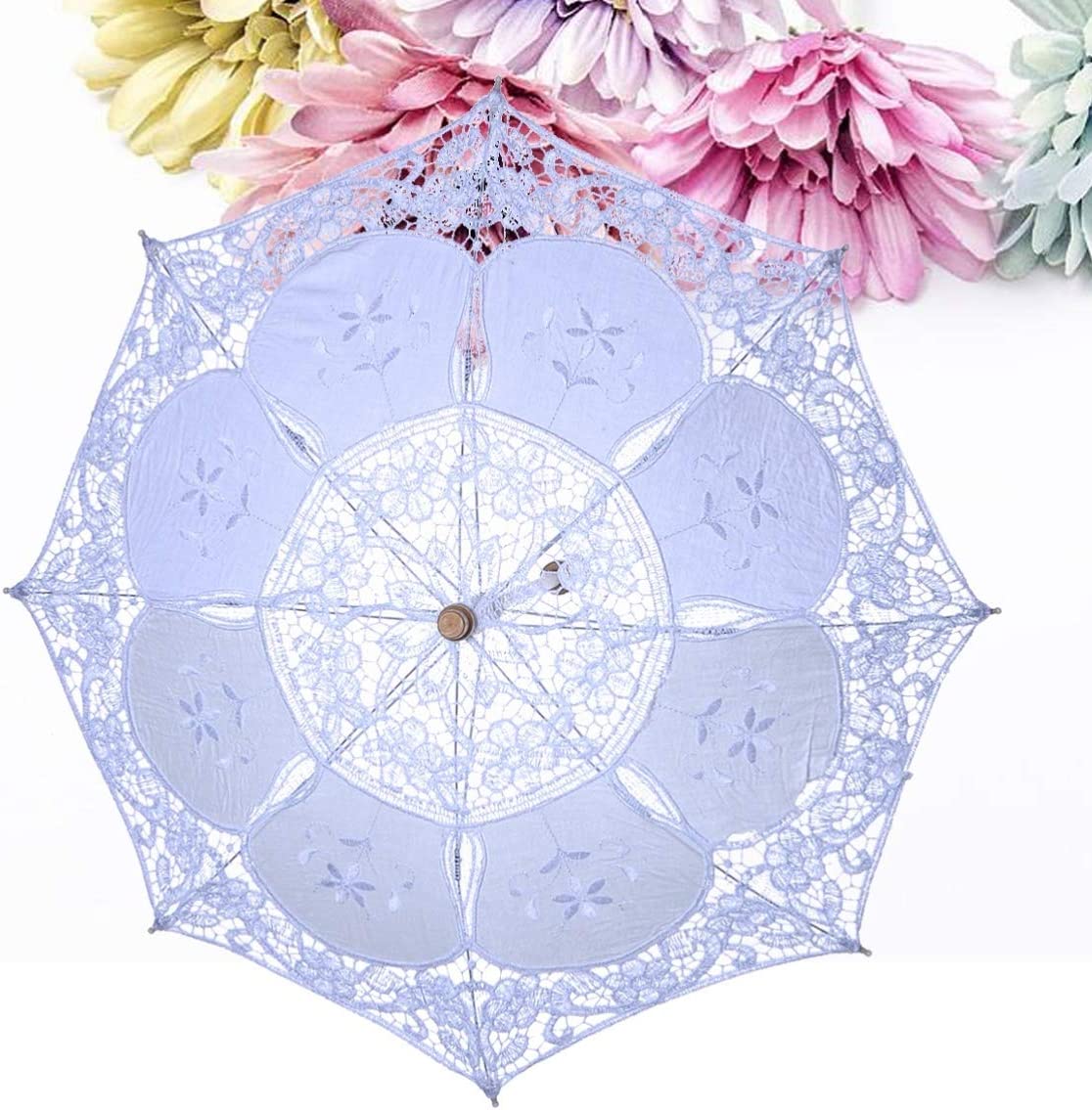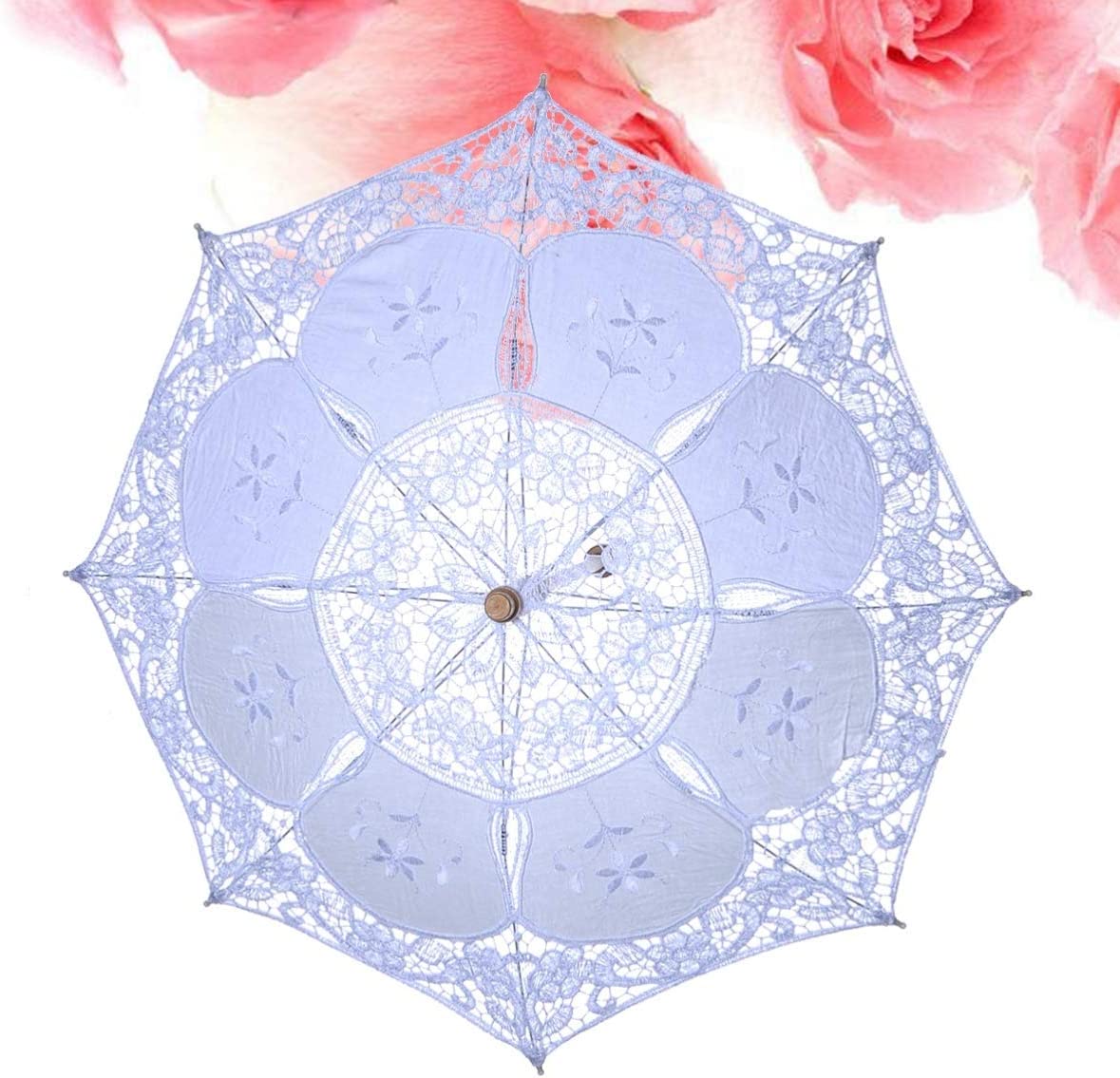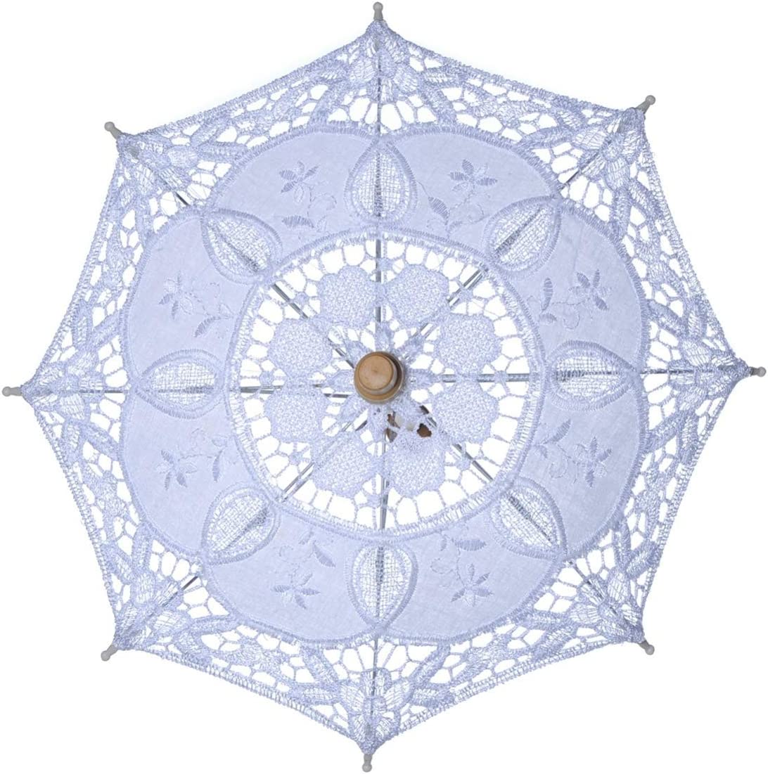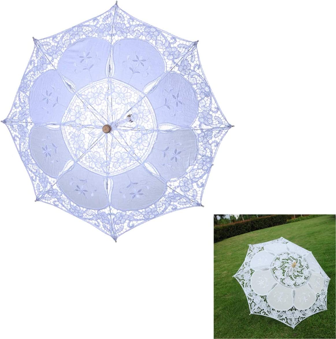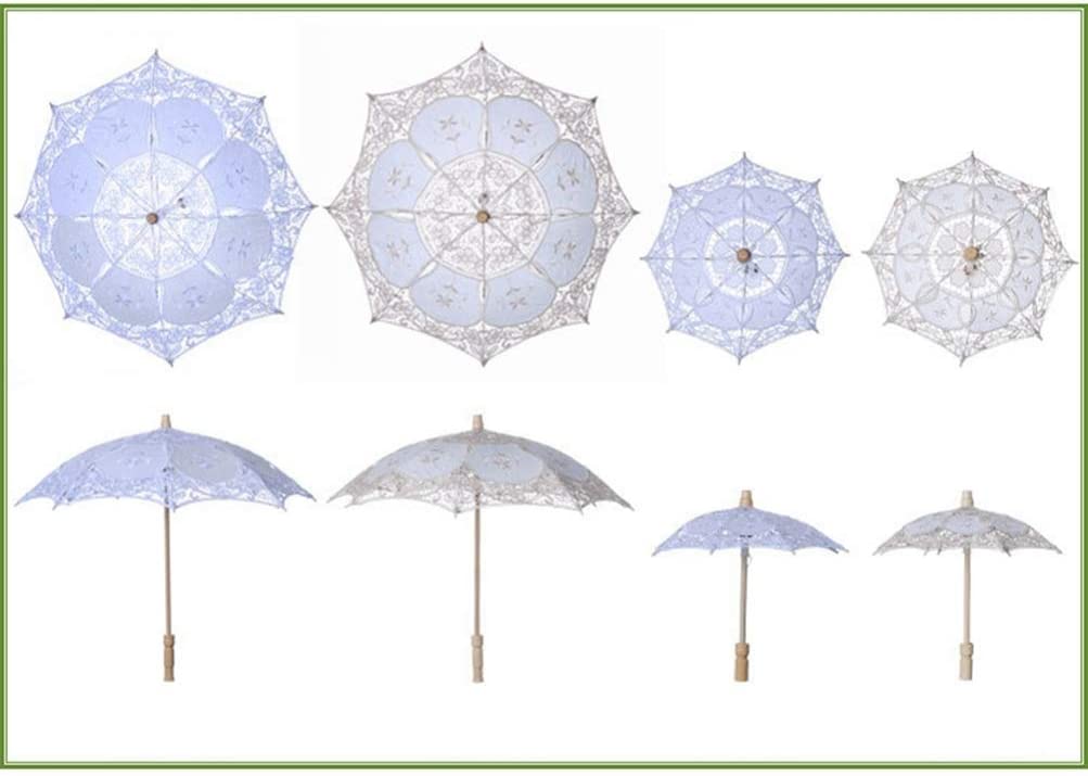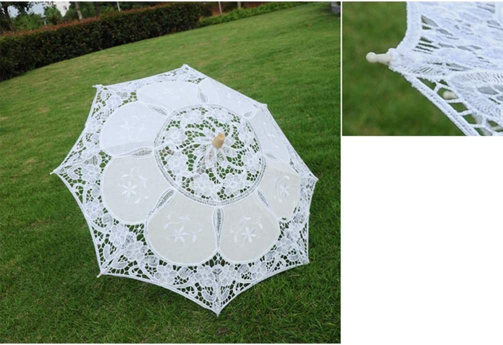 This is a very elegant lace-up parasol. Lace trim and a little embroidery make it truly beautiful and make it even more unique. It is very suitable for wedding bridal decoration photo props etc. The metal ribs and wooden handle make it strong enough to prevent wind. But it cannot be used in the rain not for rain protection.