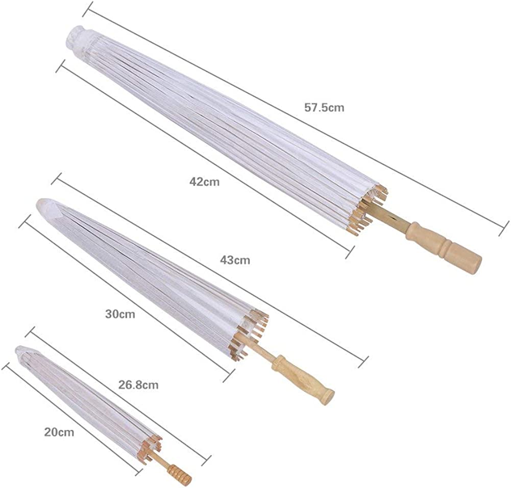 The white umbrella is consist of quality tissue paper wooden handle and bamboo ribs. The umbrella cover is smooth and glossy good handfeel.