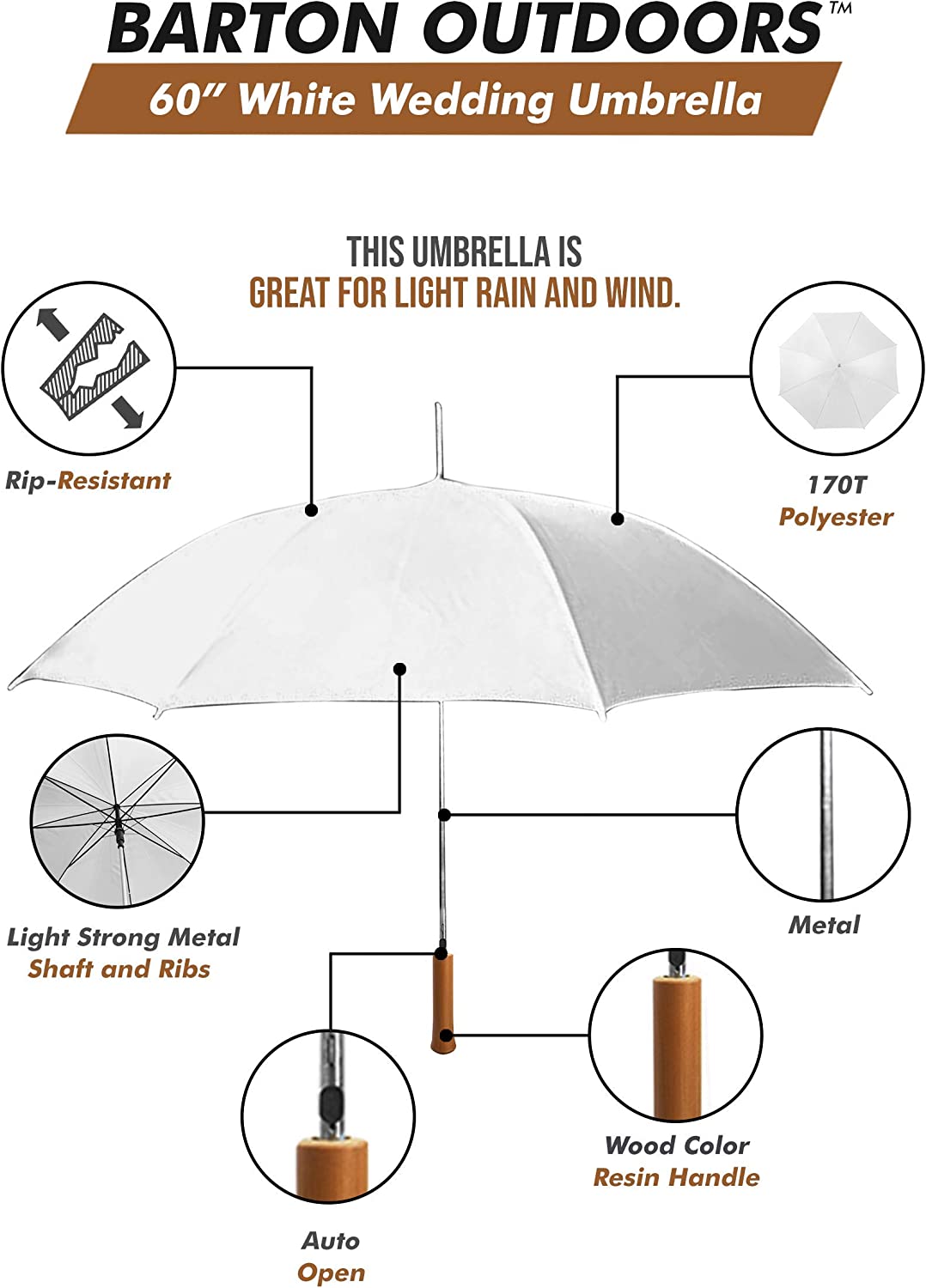 Wedding Umbrella – White – Large 60 Across – Rip-Resistant Polyester – Manual O”