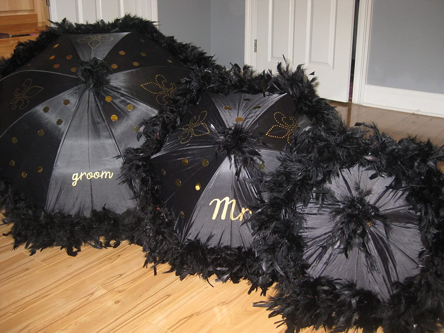 Make a fun statement with your MR. AND MRS. Bride and Groom Second Line Wedding Umbrellas. This umbrella is created to dance twirl shake and move! It includes the umbrella with FEATHER OR FRINGE trim only. No hand painting or embellishments are included.