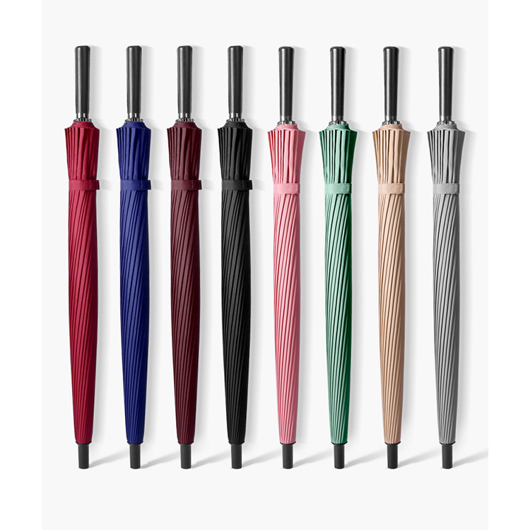 24 Ribs Wind Resistance large Golf Umbrella An excellent golf umbrella can provide a wide range of services for you and your entire family. It can shield a family of three at the same time. When opened, this oversized umbrella formed a 45-inch arc. The sturdy windproof fiberglass skeleton increases durability, while the black leather handle increases comfort. 24 Ribs golf umbrella features:Straight umbrella24 RibsEffective wind protectionWaterproof coatingWiden the umbrella surface 115cmSuitable for 2 to 3 peopleWeight: 590g