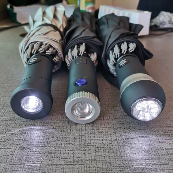 Custom Printed umbrella with LED light handles match Compact Folding Umbrella or Straight Golf Umbrella. The LED light can illuminate your road as you walk at night.