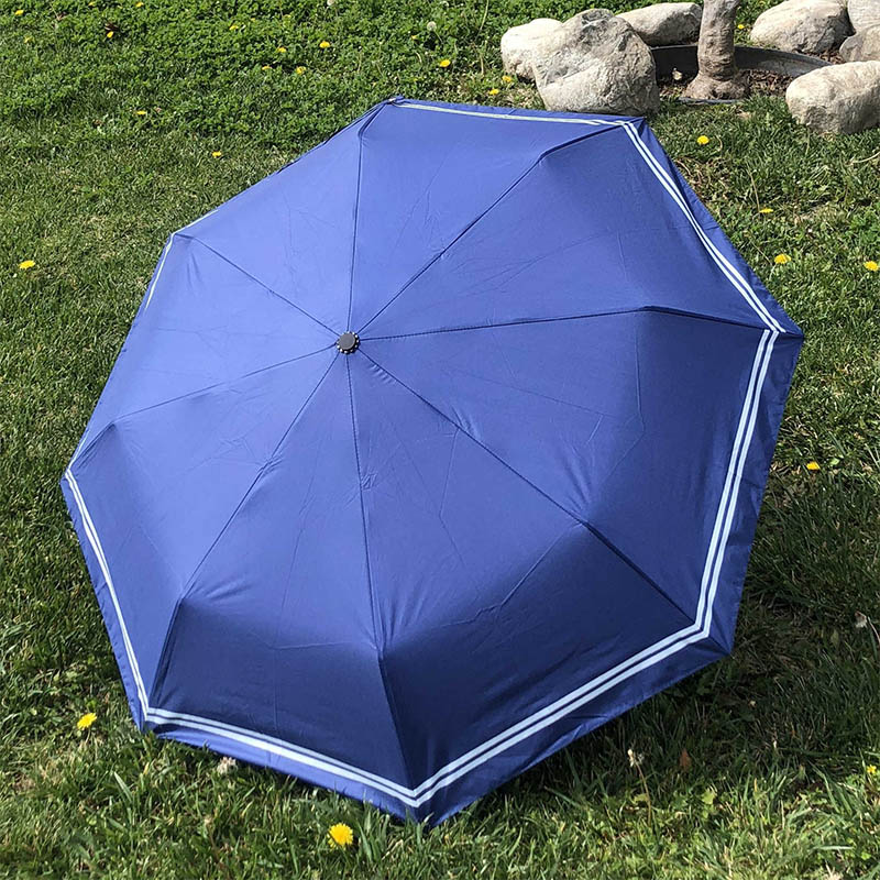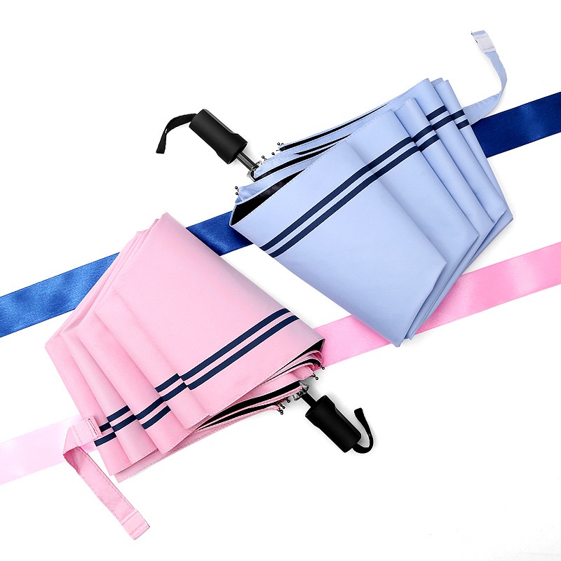 UV protection manual folding striped umbrella Folding striped umbrella feature:Category: Folding umbrellaFabric: pongeeUmbrella rib: aluminum alloyHandle: Plastic, manual openColor: pink, blue, navy blue or customizedWeight: 340g Folding striped umbrella details:High-density pongee has high-efficiency sun protection. Waterproof coating effectively prevents rainwater from leaking. The rainwater forms water droplets on the umbrella cloth, and it dries after a shake. The traditional button switch is durable, not easy to damage, safe and firm. High toughness alloy umbrella stand. Velcro umbrella strap, easy to retract. Why choose umbrella?We use the latest printing and manufacturing technology to provide you with highly customized umbrellas. Our factory produces all umbrella products and prints graphics before construction. Therefore, you have endless options to choose the perfect brand design and logo.We also use various color treatments, such as screen printing and thermal transfer printing, to ensure that we can capture the exquisite details of your brand.