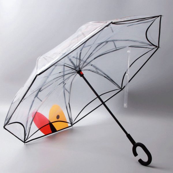 Custom Design Printed Clear Inverted Umbrellas with Branded Logo from China Youchi Factory, C Shape Handle, Double Layer Canopy, Design and Branded Logo Can Be Printing on Both Layer.